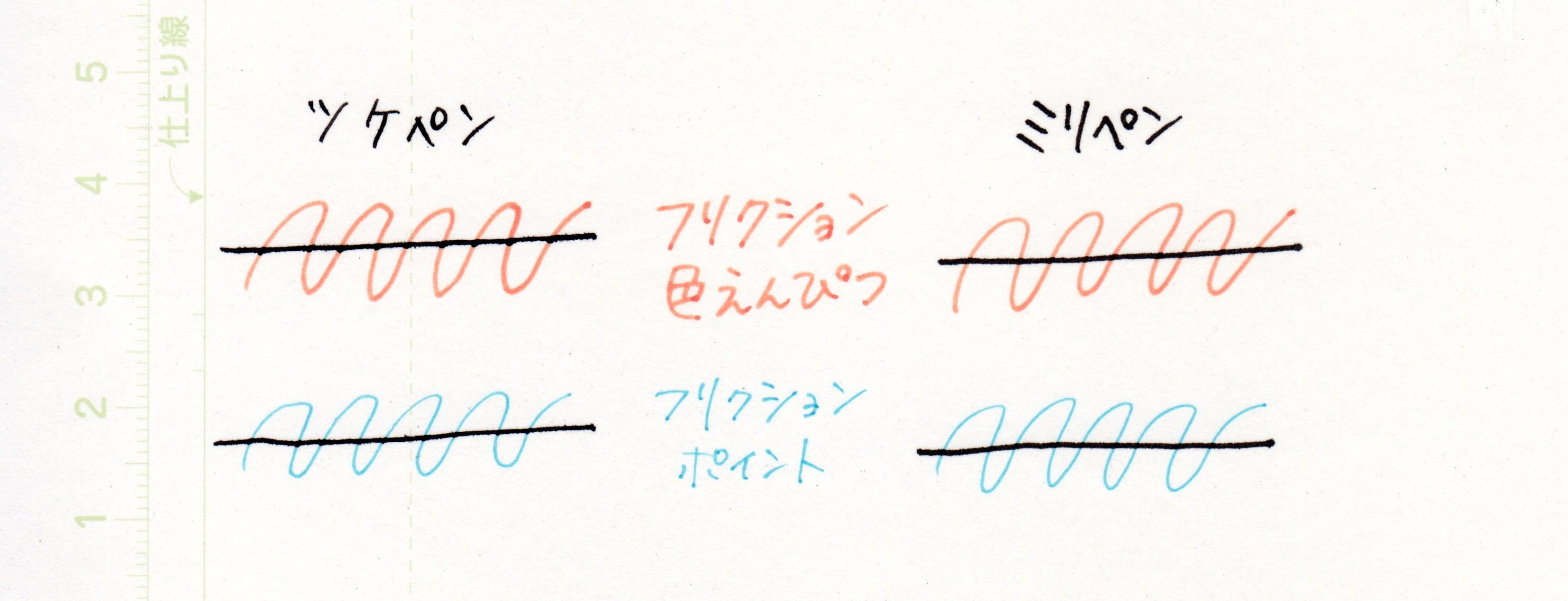 フリクションのインクに乗り上げた部分だけ太くなってしまいます。ホワイトの上から描いたような感じ。